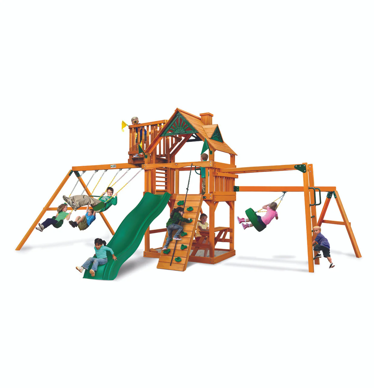 The Homestead Swing Set from Gorilla Playsets is an exciting set to have in your backyard. Not only does it come with the standard swing beam and Alpine Wave Slide™, but we've also added on some Monkey Bars and a Tire Swing beam for endless playtime options! Let the fun begin, order yours today!