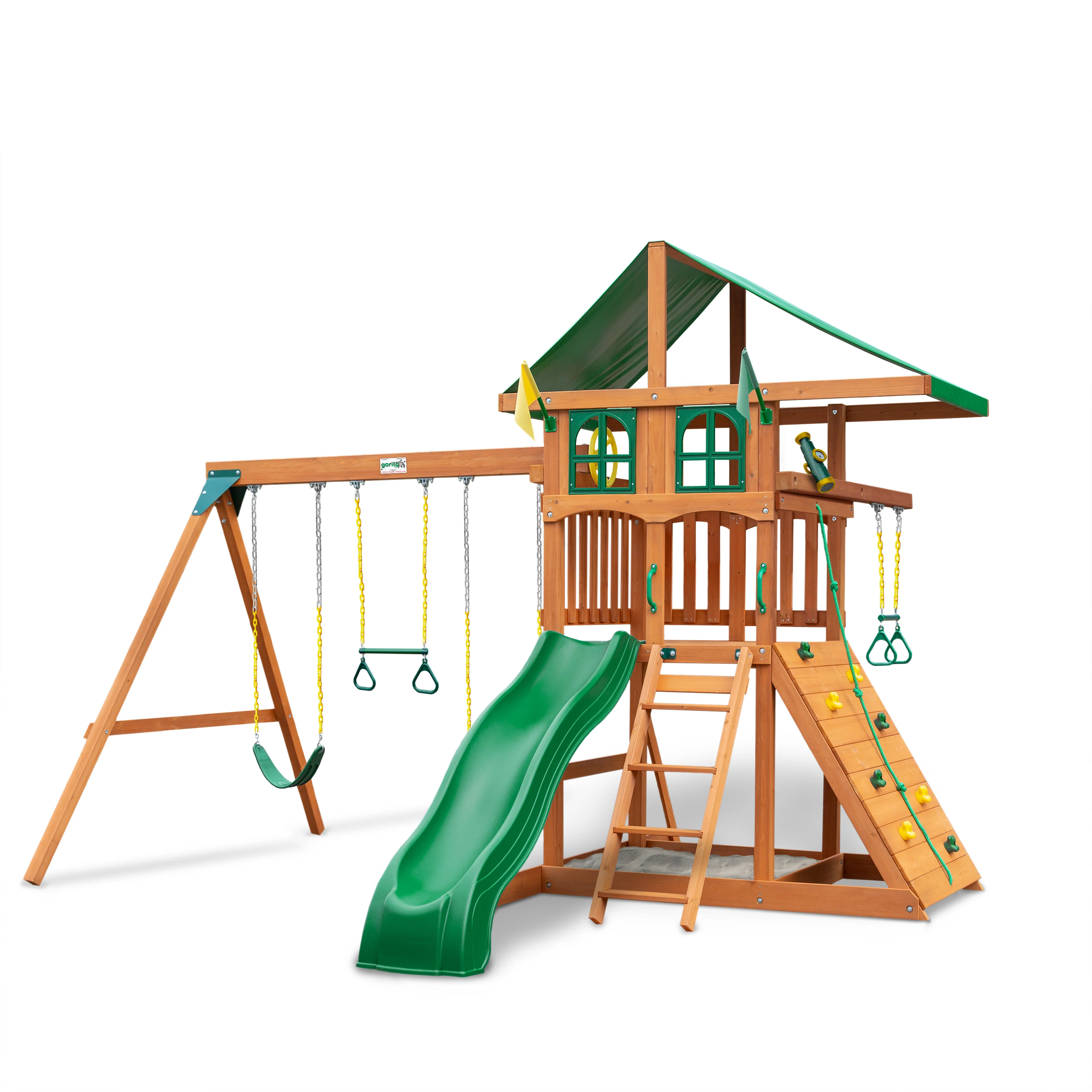 Your kids will always have a swinging good time when you have the Gorilla Playsets Outing w/ Trapeze Bar Swing Set in the yard! They can spend hours on the Alpine Wave slide, trapeze bars, or the rock wall. Outside play has just gone into overtime. Order yours today!
